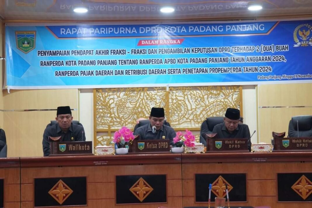 Dalam rapat paripurna yang dipimpin Ketua DPRD, Mardiansyah, S.Kom didampingi Wakil Ketua, Yulius Kaisar itu DPRD menyetujui dua Rancangan Peraturan Daerah (Ranperda) Kota Padang Panjang Tahun 2024 menjadi Perda. Dua ranperda yang disetujui yaitu Ranperda APBD Kota Padang Panjang Tahun Anggaran 2024, Ranperda Pajak dan Retribusi Daerah. Serta Penetapan Propemperda 2024.