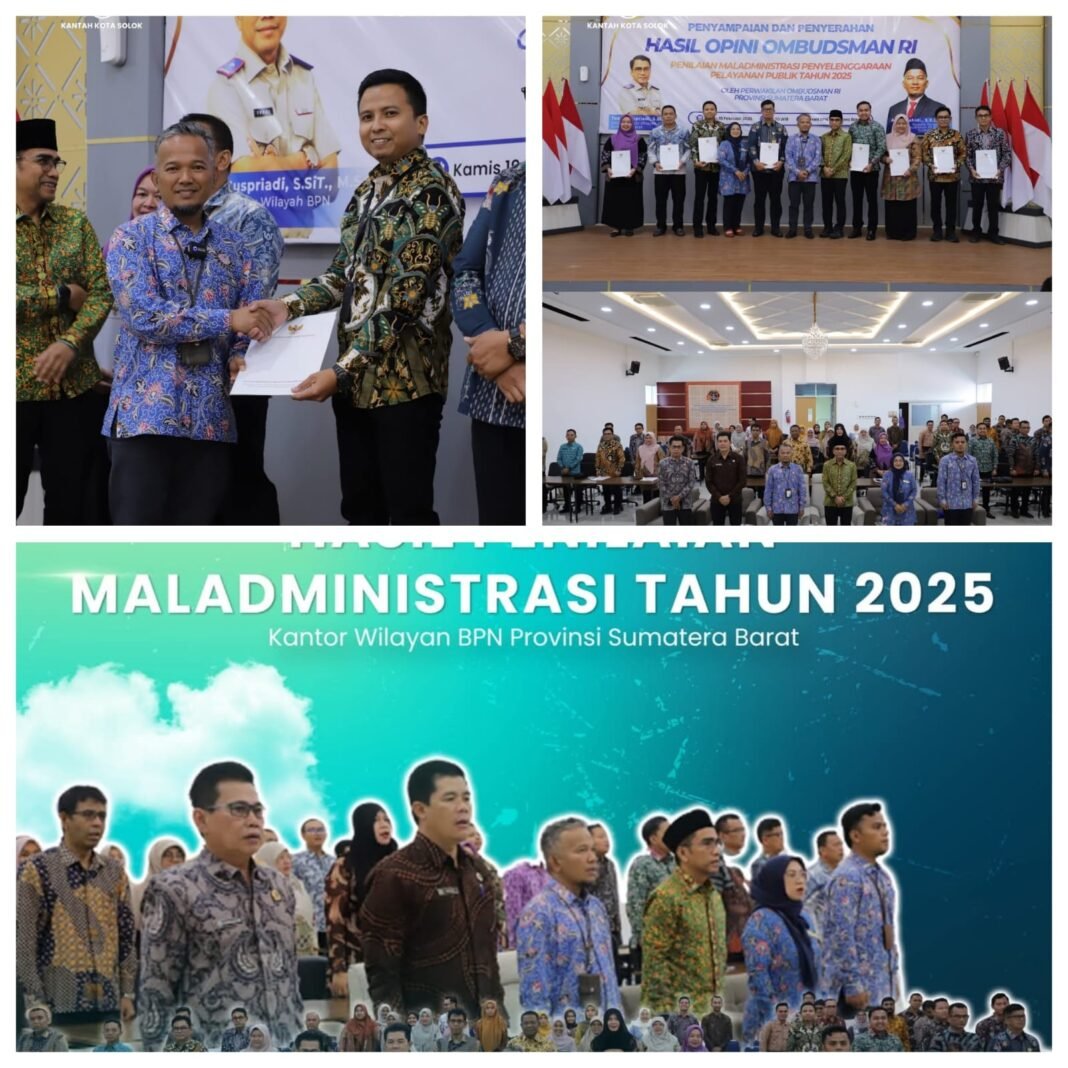 Tepatnya Kamis (19/02/2026). Kantah Kota Solok mengikuti kegiatan Penyerahan Hasil Penilaian Maladministrasi Tahun 2025 yang diselenggarakan oleh Perwakilan Ombudsman Republik Indonesia Provinsi Sumatera Barat, bertempat di Aula Rumah Gadang Kantor Wilayah BPN Provinsi Sumatera Barat,