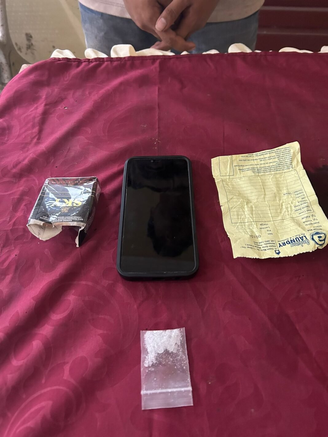 Setelah pelaku diamankan, dilakukan penggeledahan ditemukan satu buah kotak rokok merek Sky di pinggir jalan tidak jauh dari penangkapan. Didalamnya berisi satu paket menengah narkotika jenis sabu dibungkus plastik klip warna bening yang dilapisi kertas warna kuning.