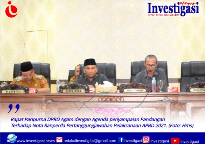 Agam, Investigasi.news – Dewan Perwakilan Rakyat Daerah (DPRD) Kabupaten Agam menggelar Rapat Paripurna Penyampaian Pandangan Umum Fraksi DPRD Agam terhadap Nota Pengantar Bupati Agam atas Rancangan Peraturan Daerah (Ranperda) Tentang Pertanggungjawaban Pelaksanaan APBD Tahun Anggaran 2021.