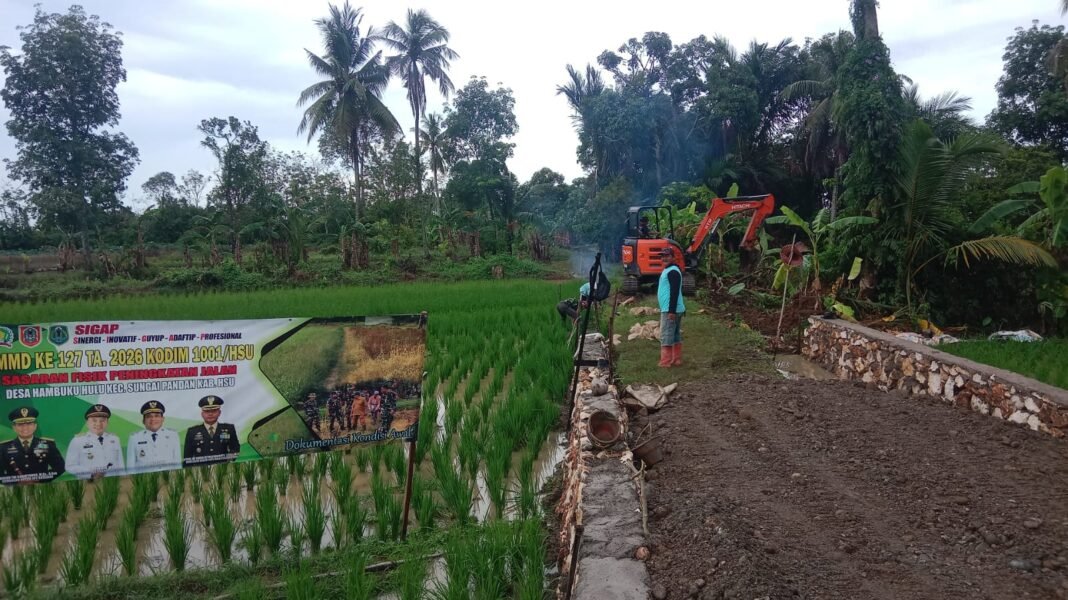 Amuntai, investigasi.news – Pembangunan jalan usaha tani oleh Satgas TMMD ke 127 Kodim 1001/HSU di Desa Hambuku Hulu, Kecamatan Sungai Pandan, Kabupaten Hulu Sungai Utara, mulai memasuki tahap pengerjaan fisik. Jalan sepanjang ±200 meter dengan lebar 6 meter ini kini mulai diratakan menggunakan alat berat untuk mempercepat proses.Sabtu (21/02/2026)