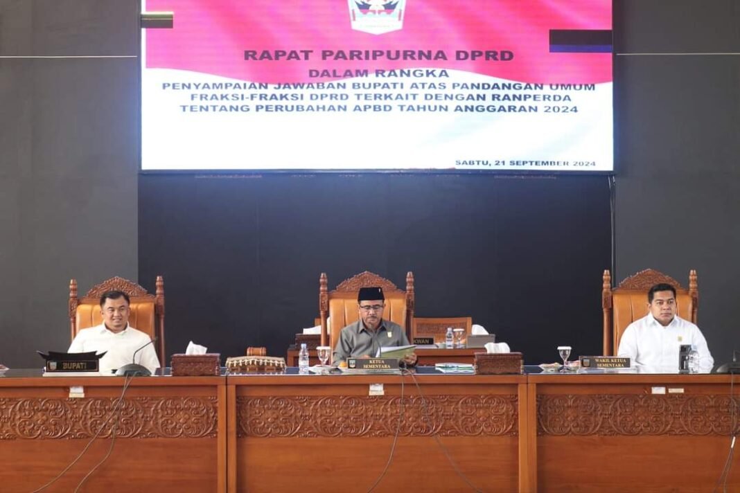 Pandangan umum yang disampaikan oleh tujuh Fraksi DPRD pada rapat paripurna Jum’at, 20 September 2024 kemaren memberikan informasi, masukan serta saran terkait Perubahan APBD Kabupaten Dharmasraya yang menjadi representasi dari harapan dan keinginan dari masyarakat. Dari hasil pandangan Fraksi DPRD tersebut Bupati Dharmasraya Sutan Riska Tuanku Kerajaan,S.E,M.A.P sampaikan jawaban sampaikan jawaban pada rapat paripurna yang diselenggarakan di Ruang Rapat Utama DPRD Kabupaten Dharmasraya. Sabtu,(21/09/2024).