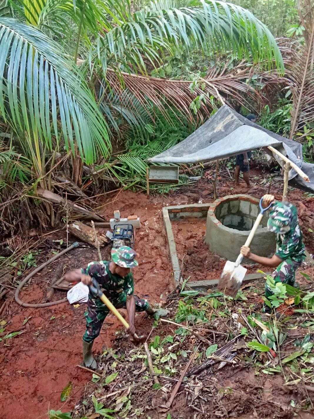 Satgas TMMD dengan semangat gotong royong menimbun kerabat sumur air bersih dengan material tanah yang telah disiapkan. Penimbunan ini bertujuan untuk memperkuat struktur sumur, mencegah erosi, dan menjaga kualitas air agar tetap bersih dan layak konsumsi. Kondisi tanah yang berlumpur tidak menyurutkan semangat anggota Satgas dalam menyelesaikan pekerjaan ini.