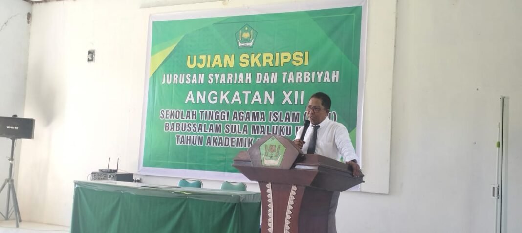 Sambutan Ketua STAI Babussalam Sula dalam kegiatan tersebut disampaikan oleh Wakil Ketua Bidang Akademik, Dr. Mohtar Umasugi, S.Ag., M.Pd.I. Dalam sambutannya, ia menegaskan bahwa ujian skripsi harus dimaknai sebagai bentuk pertanggungjawaban ilmiah dan moral atas proses akademik yang telah dijalani mahasiswa selama bertahun-tahun.