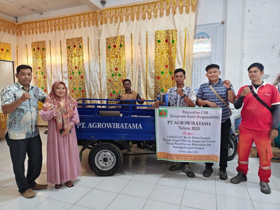 “Di penghujung tahun 2025 ini, Musim Mas Group melalui anak perusahaannya PT Agrowiratama yang beroperasi di Kecamatan Sungai Aur memberikan Satu unit Becak Motor kepada Nagari Sikilang Sungai Aur Selatan “, kata GM PT Agrowiratama Sijon.