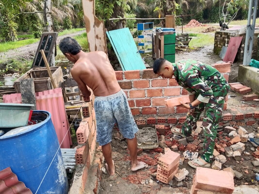 BANYUASIN – Satuan Tugas (Satgas) TNI Manunggal Membangun Desa (TMMD) ke-127 Kodim 0430/Banyuasin (BA) bersama masyarakat Desa Wonosari terus memacu pengerjaan rehabilitasi Rumah Tidak Layak Huni (RTLH) milik Ibu Suwarti. Pemasangan bata dikebut agar pembangunan dapat selesai sebelum penutupan TMMD 127.