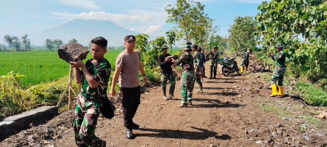 Danramil 02/Karangmalang Lettu Arh Ifa Aiwan Kristono memimpin langsung pengerjaan Talud dan Pengecoran Jalan program TMMD REG ke-128 TA. 2026 Kodim 0725/Srg di Desa Puro Kecamatan Karangmalang Kabupaten Sragen. Sebelum memulai pengecoran, anggota TMMD mengangkut bongkahan batu dengan cara estafet dari tumpukan batu ke lokasi pengecoran.