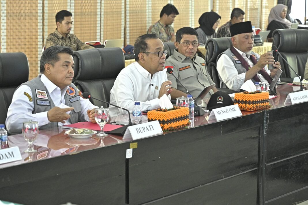 Sebelum peresmian huntara, Menko PMK bersama rombongan mengikuti pertemuan paparan progres penanganan bencana di Sumbar yang berlangsung di Balairung Rumah Dinas Bupati Agam. Pertemuan tersebut dihadiri Kepala Badan Nasional Penanggulangan Bencana (BNPB) Letjen TNI Dr. Suharyanto, Gubernur Sumbar Mahyeldi Ansharullah, Bupati Agam Benny Warlis, Wakil Kepala BPS RI Dr. Soni Hari Budi Utomo Harmadi, Deputi Kemenko PMK, unsur TNI dan Polri, serta para kepala daerah dan Forkopimda se-Sumbar.
