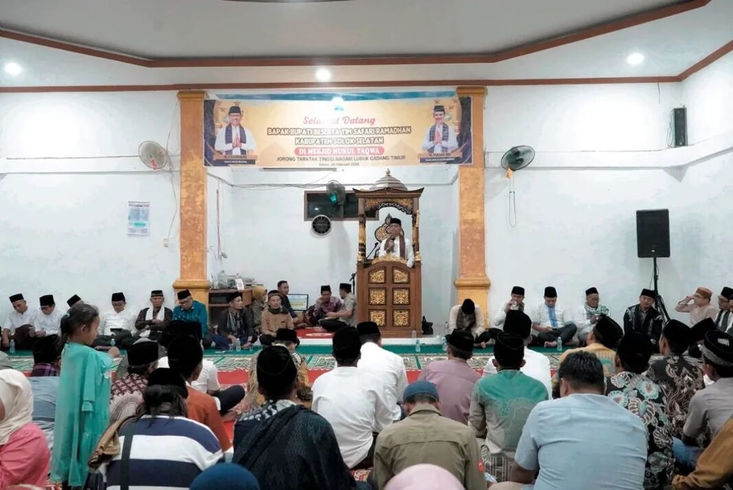 Solok Selatan — Kehangatan kebersamaan dan semangat religius terasa kuat saat Tim Safari Ramadhan Pemerintah Kabupaten Solok Selatan mengunjungi masyarakat Nagari Lubuk Gadang Timur, Selasa (24/02/2026). Kegiatan yang dipimpin langsung oleh Bupati Khairunas ini berlangsung di Masjid Nurul Taqwa dan disambut antusias oleh masyarakat setempat.