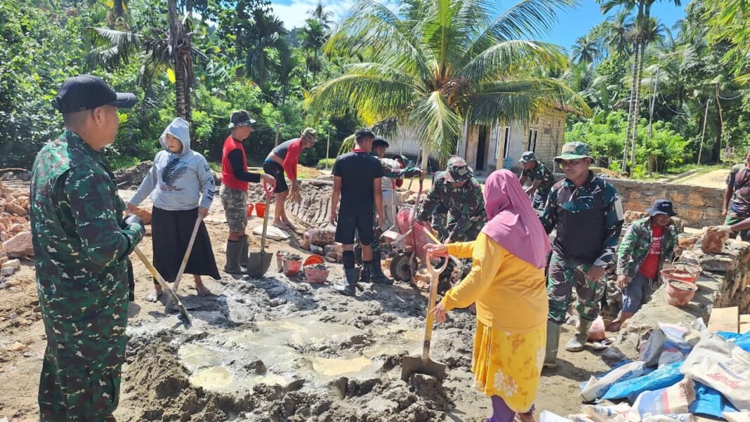 Kendari – Pemandangan penuh kebersamaan terlihat di lokasi TNI Manunggal Membangun Desa (TMMD) ke-127 Kodim 1417/Kendari, di mana sejumlah ibu-ibu dari Kelurahan Sambuli terjun langsung membantu anggota Satgas pada Selasa (24/2).