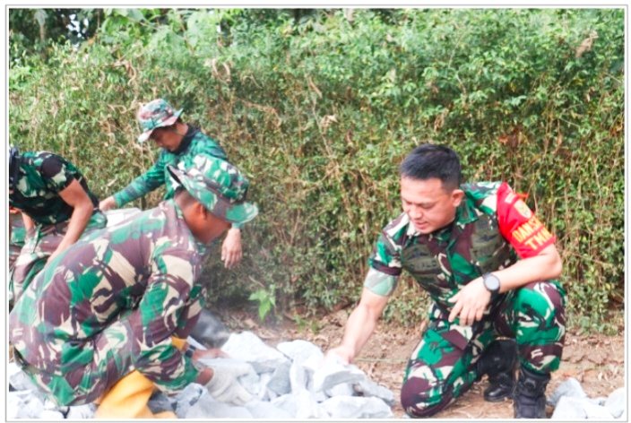 Dansatgas TMMD ikut serta menyusun batu pengerasan telford