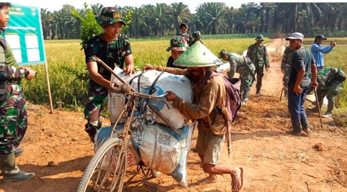 Bukti cinta TNI kepada Rakyat, Personel Satgas TMMD ke 125 Kodim 0411/KM bantu warga melintas di titik pembuatan gorong-gorong
