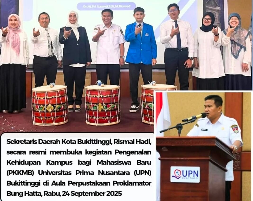 Bukittinggi, investigasi.news- Sekretaris Daerah Kota Bukittinggi, Rismal Hadi, secara resmi membuka kegiatan Pengenalan Kehidupan Kampus bagi Mahasiswa Baru (PKKMB) Universitas Prima Nusantara (UPN) Bukittinggi di Aula Perpustakaan Proklamator Bung Hatta, Rabu, 24 September 2025.
