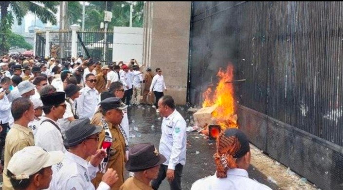 Asosiasi Pemerintah Desa Seluruh Indonesia (Apdesi) menggelar aksi unjuk rasa di depan Gedung DPR/MPR/DPD, Kamis (23/11/2023).