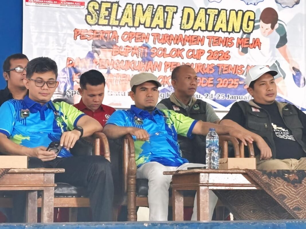 Koto Baru – Wakil Bupati Solok, H. Candra, S.H.I menghadiri sekaligus membuka secara resmi kegiatan Open Tournament Tenis Meja Bupati Solok Cup 2026 yang dirangkaikan dengan Pengukuhan Pengurus Persatuan Tenis Meja Seluruh Indonesia (PTMSI) Kabupaten Solok Periode 2025–2029, bertempat di Hall Batu Batupang Koto Baru, Minggu (25/01/2026).