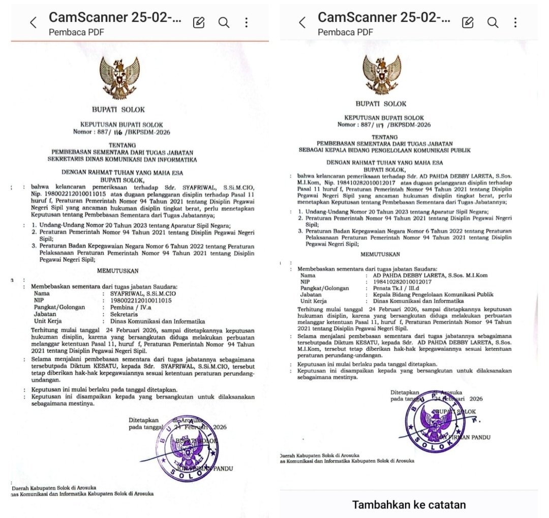 Bupati Solok, Jon Firman Pandu, resmi mengeluarkan dua Surat Keputusan (SK) bernomor 887/116 dan 887/117/BKPSDM-2026 tentang pembebasan sementara dari jabatan terhadap Sekretaris dan Kepala Bidang PKP Dinas Kominfo Kabupaten Solok. Kedua ASN tersebut dinyatakan terbukti melakukan pelanggaran disiplin berat.