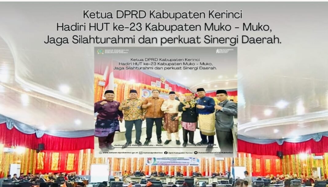 Kerinci, Investigasi.News – Ketua DPRD Kabupaten Kerinci bersama Sekretaris DPRD (Sekwan) menghadiri peringatan Hari Ulang Tahun (HUT) ke-23 Kabupaten Mukomuko yang digelar pada 25 Februari 2026. Kehadiran rombongan dari Kabupaten Kerinci tersebut menjadi simbol dukungan sekaligus komitmen memperkuat hubungan antardaerah.
