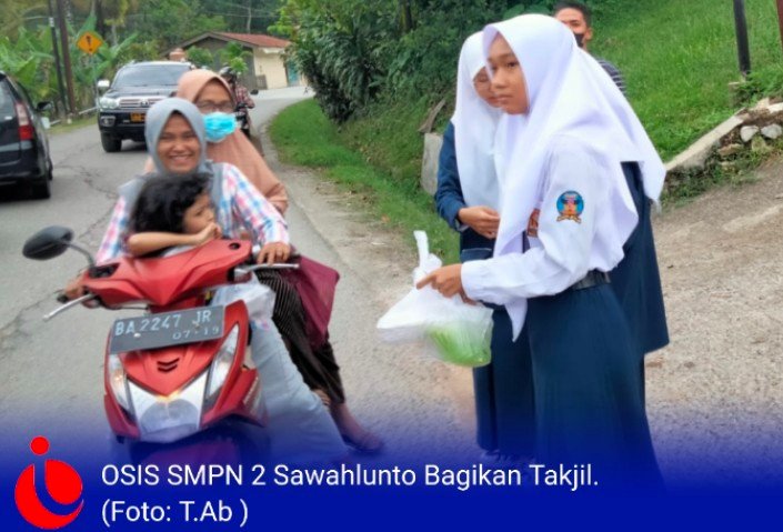 Dipimpin Ketua OSIS SMPN 2 Sawahlunto Muiza Ahmad Zaki beberapa pengurus OSIS memberikan takjil kepada pengendara motor atau pengguna jalan yang melalui ruas jalan itu.