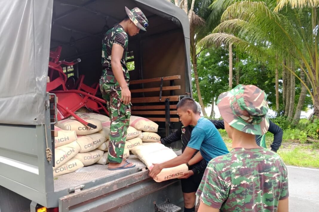 Para prajurit tampak bekerja dengan penuh tanggung jawab dan gotong royong saat memindahkan material dari kendaraan pengangkut menuju lokasi proyek. Kehadiran personel TMMD di lokasi tidak hanya bertujuan untuk memperlancar distribusi logistik, tetapi juga untuk memastikan bahwa seluruh bahan bangunan tersedia tepat waktu sehingga proses pembangunan dapat berjalan maksimal tanpa hambatan.