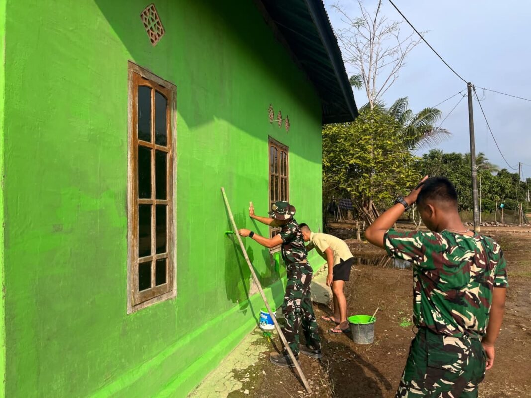 Saat ini, Satgas TMMD bersama masyarakat setempat telah memulai proses pengecatan mushola. Tampak anggota Satgas TMMD dan warga bergotong royong mengaplikasikan cat berwarna cerah pada dinding mushola, memberikan tampilan baru yang lebih segar dan menarik.