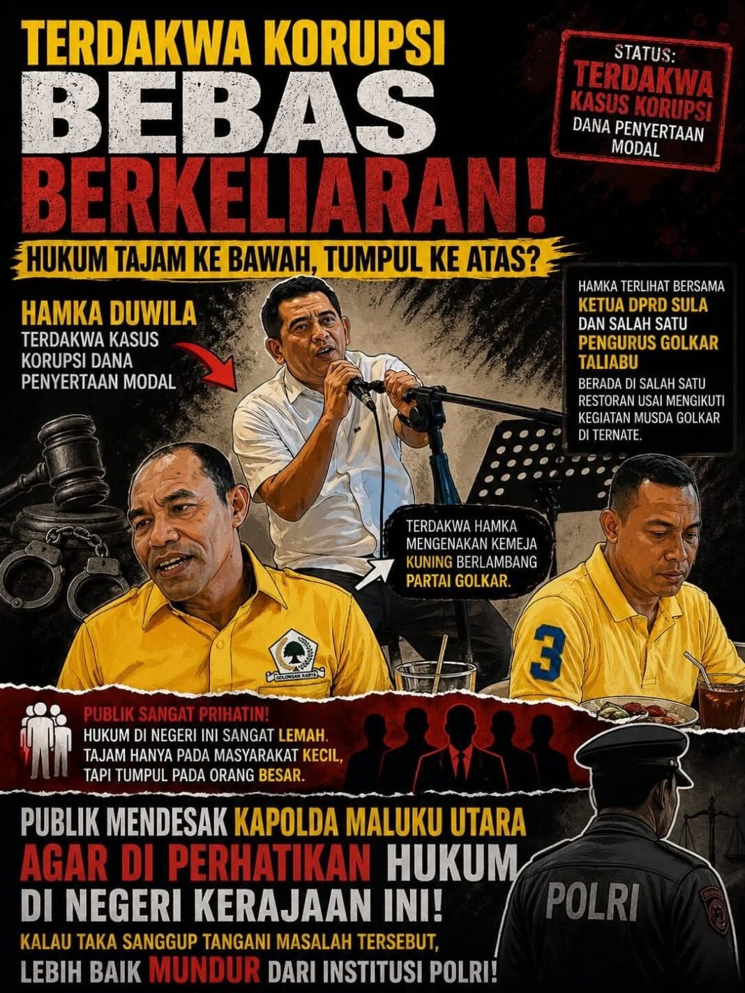 Tudingan kerap meresahkan, dan gemar memproduksi infomasi hoax dan ujaran kebencian merupakan fakta yang tidak terbantahkan untuk akun fake ‘Nyong Jorjoga’, seperti baru-baru ini, akun tersebut menyerang H. Hamka Duwila, terpidana kasus Korupsi Perusda Taliabu, bukan hanya membuat meme bermuatan infomasi hoax, akun fake Nyong Jorjoga juga membuat tulisan yang kesemuanya tanpa validasi, tanpa observasi maupun riset sehingga secara membabi buta menyerang Polisi, Hakim dan Jaksa (APH) dan menuding H. Hamka bebas berkeliaran meski didalam penjara, bahkan secara terang-terangan akun ini menyerang bahwa H. Hamka keluar penjara dan ikut Musda, Partai Golkar yang digelar 12 April 2026 kemarin di Ternate.