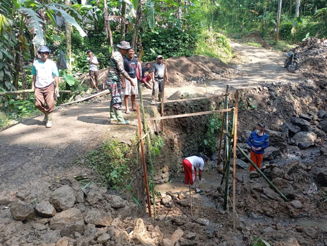 PURBALINGGA — Di antara suara adukan semen dan derap langkah warga yang hilir mudik membawa material, proses pengecoran pondasi pelebaran jembatan plat beton dalam program TMMD menjadi pemandangan yang penuh makna. Bukan sekadar pekerjaan konstruksi, tetapi awal dari harapan baru bagi akses yang lebih layak dan kehidupan yang lebih bergerak.