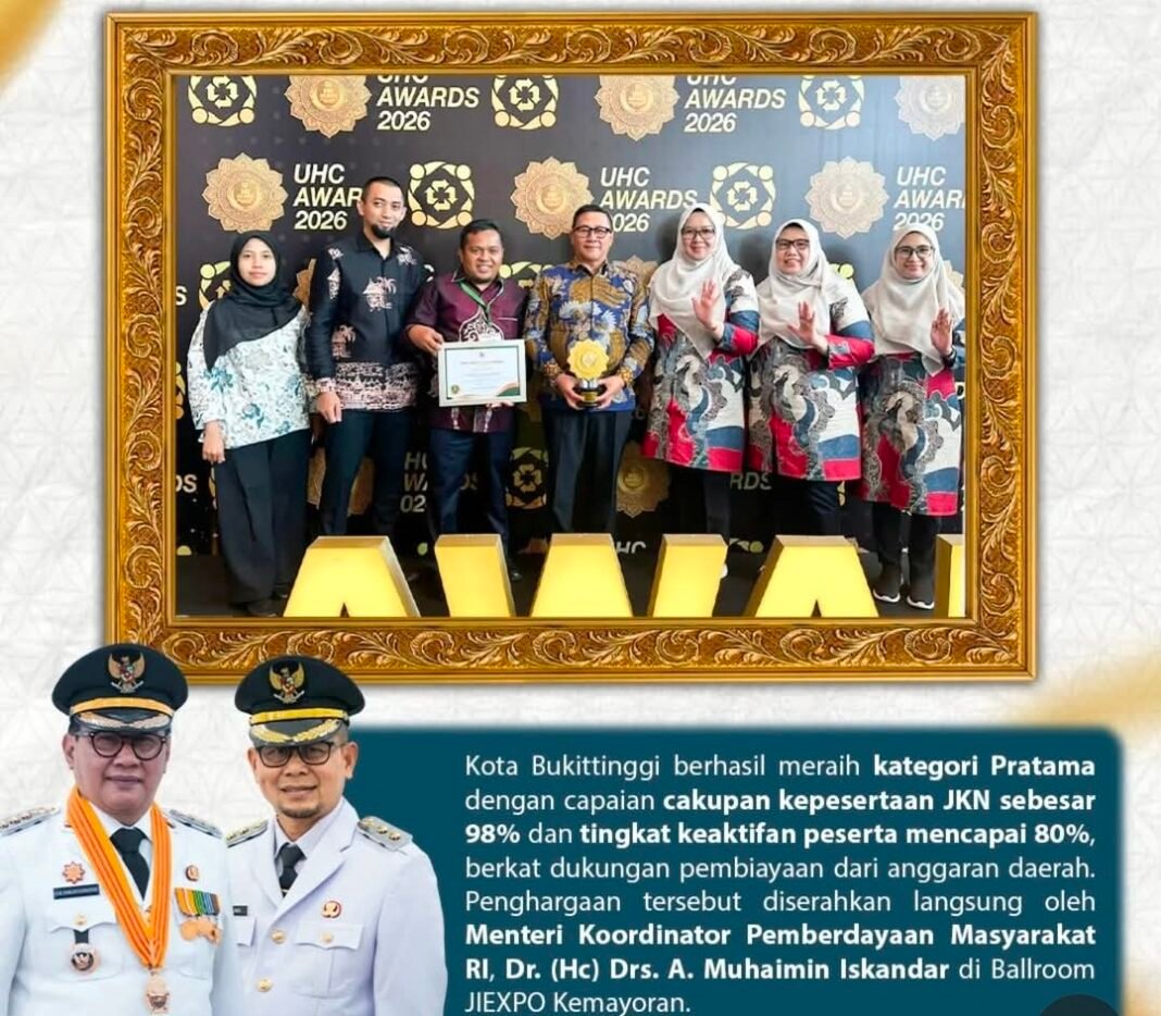 Sementara itu, Wali Kota Bukittinggi Ramlan Nurmatias, didampingi Kepala Dinas Kesehatan Ramli, menyampaikan bahwa kembali diraihnya UHC Award pada tahun 2026 menunjukkan komitmen Pemko Bukittinggi dalam memberikan perlindungan dan jaminan kesehatan bagi masyarakat, sekaligus memastikan akses layanan kesehatan yang merata, tepat sasaran dan berkeadilan.