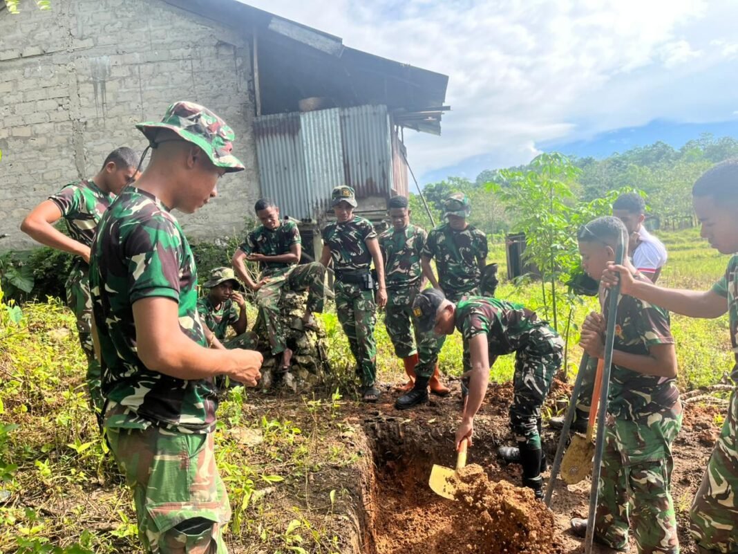 Kegiatan ini merupakan bagian dari upaya TNI dalam meningkatkan kualitas sanitasi dan kesehatan masyarakat di wilayah pedesaan. Dengan penuh semangat, anggota Satgas bersama warga setempat bahu-membahu melakukan penggalian lubang sebagai dasar pembangunan fasilitas MCK yang layak dan higienis.