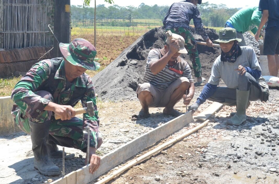 Dalam kesempatan tersebut tanpa rasa canggung ataupun gengsi sebagai perwira, Lettu Inf Endri Marjiyono turut membantu dalam penyiapan begisting cor jalan bersama salah satu warga desa Purwogondo.