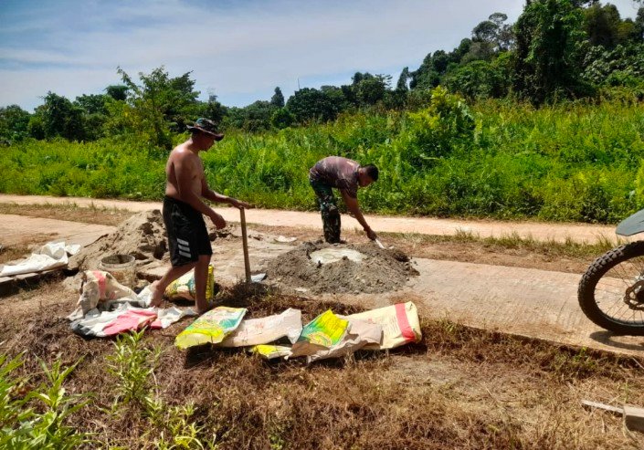 Tampak dengan penuh semangat anggota satgas TMMD Kodim 0914/TNT bersama warga melakukan pengadukan semen di lokasi titik sasaran Rehab Mandi Cuci Kakus (MCK) Bapak Gatot..