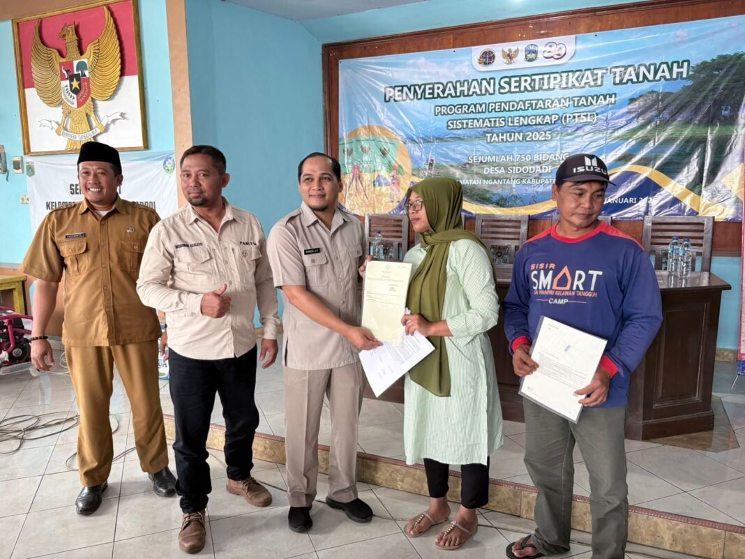 Kantor Pertanahan Kabupaten Malang melaksanakan kegiatan penyerahan sertipikat tanah Program Pendaftaran Tanah Sistematis Lengkap (PTSL) Tahun 2025 kepada masyarakat Desa Sidodadi, Kecamatan Ngantang, Kabupaten Malang. Penyerahan sertipikat dilakukan secara simbolis oleh Ketua Tim V PTSL Kantor Pertanahan Kabupaten Malang, Rangga Alfiandri Hasim, S.ST., M.H. kepada warga penerima.