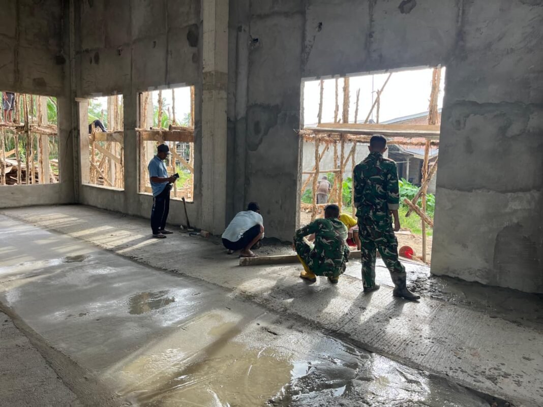 Dengan semangat gotong royong, anggota Satgas TMMD dan masyarakat bahu-membahu mengaduk semen, mengangkut material, dan meratakan adonan cor di lantai masjid. Pengecoran lantai ini merupakan bagian penting dari pembangunan masjid yang lebih layak dan nyaman untuk beribadah.
