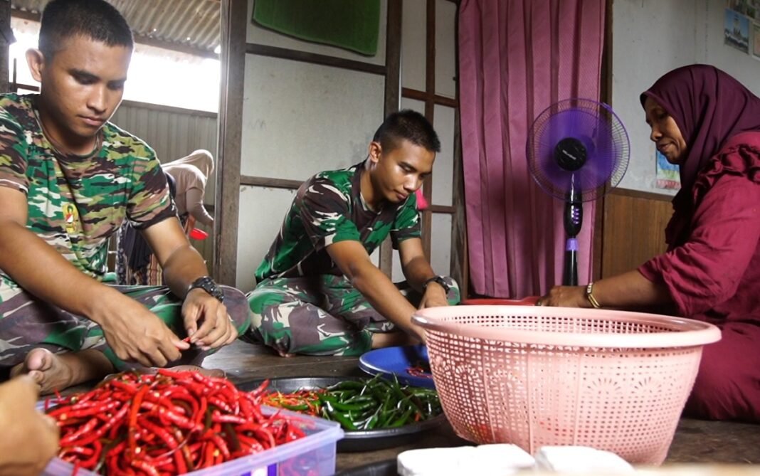 Kehadiran anggota Satgas TMMD di dapur warga menjadi pemandangan yang akrab dan sarat kehangatan. Tanpa canggung, Serda Gilang dan reka-rekan ikut menyiapkan bahan masakan hingga proses memasak, membaur bersama warga layaknya keluarga sendiri.