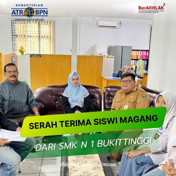 Hari ini, Kantor Pertanahan Kota Solok menerima kehadiran siswi magang dari SMK Negeri 1 Bukittinggi dalam kegiatan serah terima PKL (Praktik Kerja Lapangan).