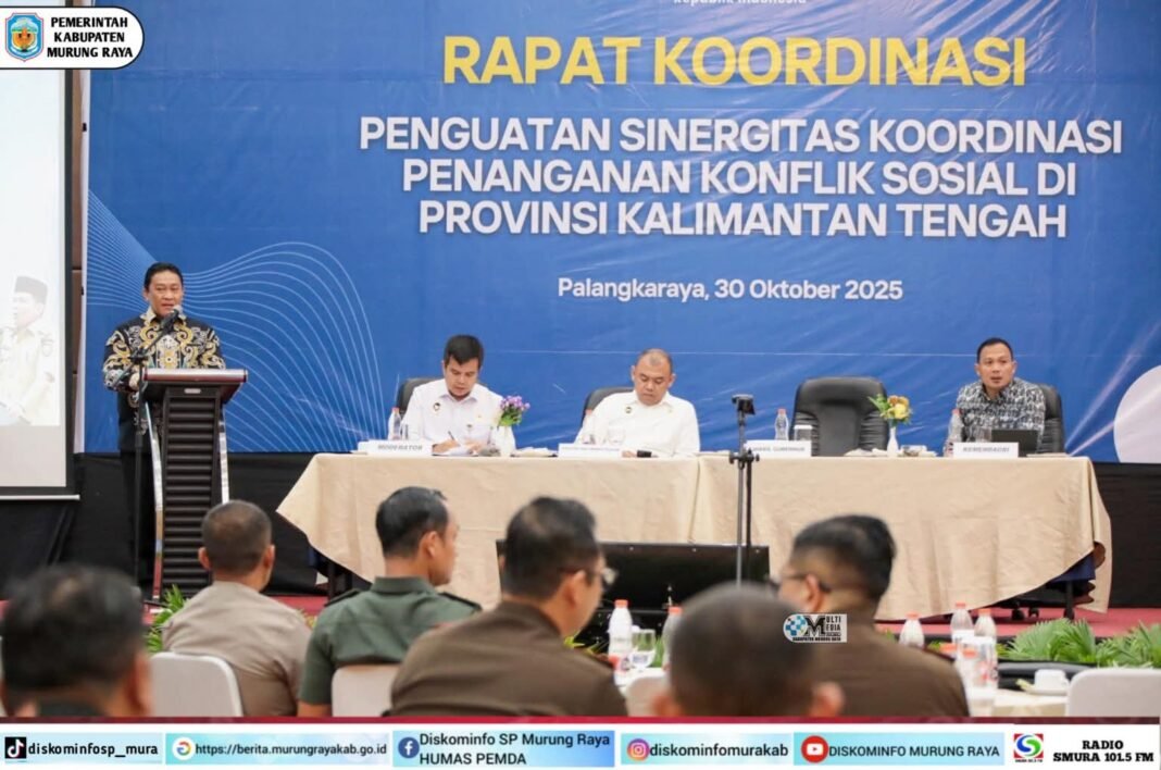 Palangka Raya, investigasi.news– Bupati Murung Raya (Mura), Heriyus melalui Wakil Bupati Mura, Rahmanto Muhidin menghadiri dan sekaligus mengikuti rapat koordinasi penguatan sinergitas koordinasi penanganan konflik sosial di Provinsi Kalimantan Tengah.