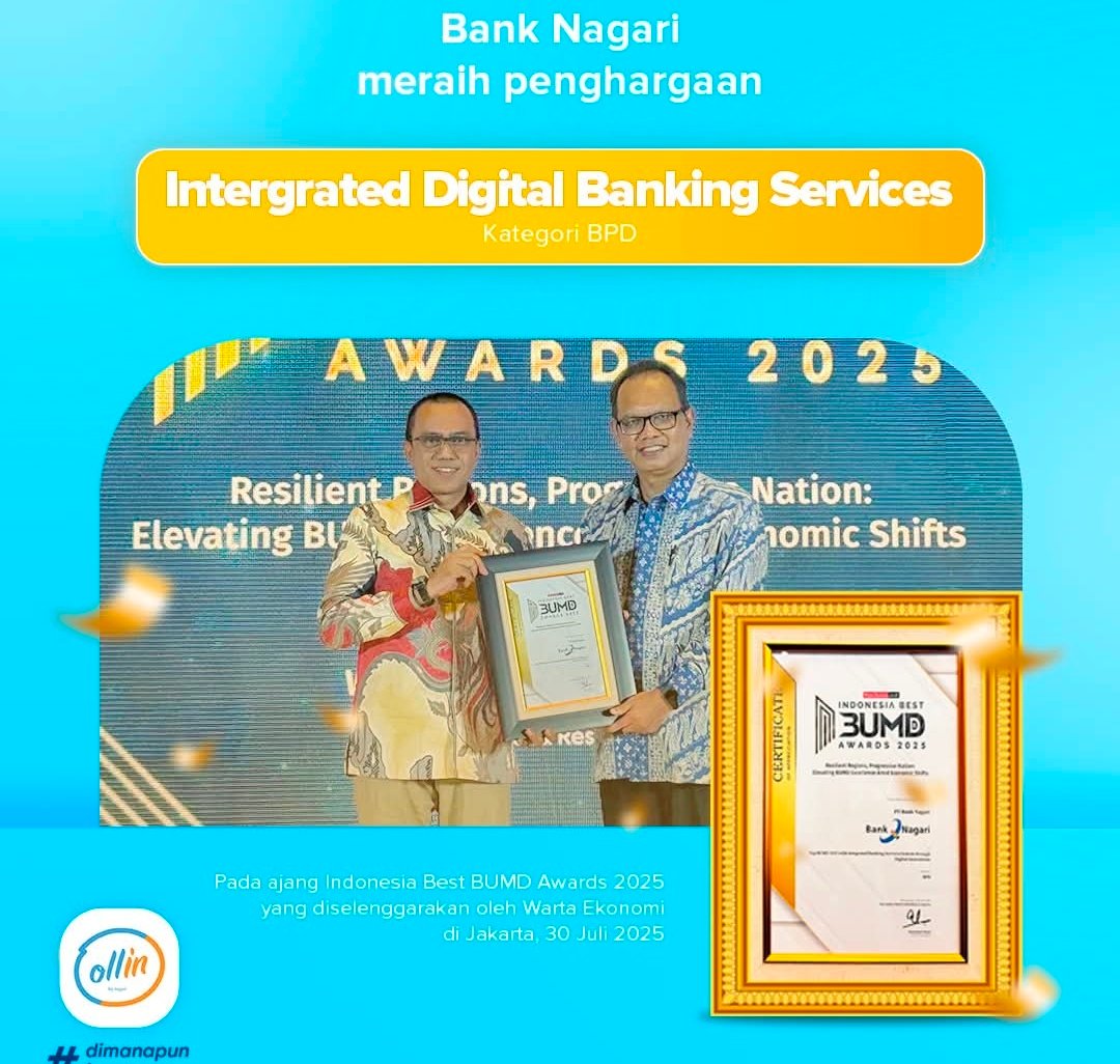 Jakarta, – Prestasi membanggakan kembali ditorehkan oleh Bank Nagari di penghujung Juli 2025. Kali ini, bank kebanggaan masyarakat Sumbar itu berhasil meraih penghargaan Intergrated Digital Banking Services (BPD) pada ajang Indonesia Best BUMD Awards 2025 yang digelar Warta Ekonomi di The Sultan Hotel & Residence, Jakarta, Rabu (30/7).